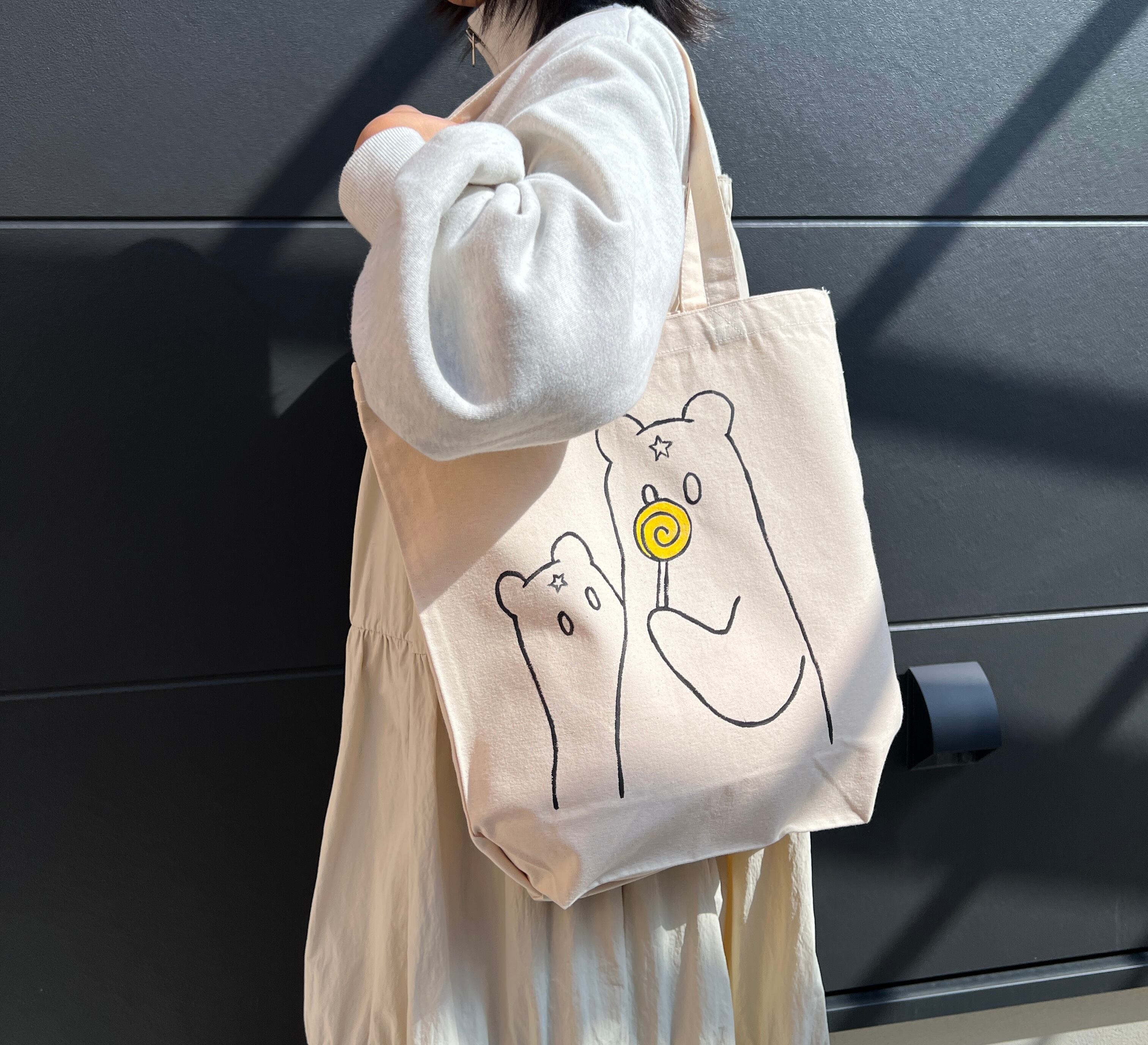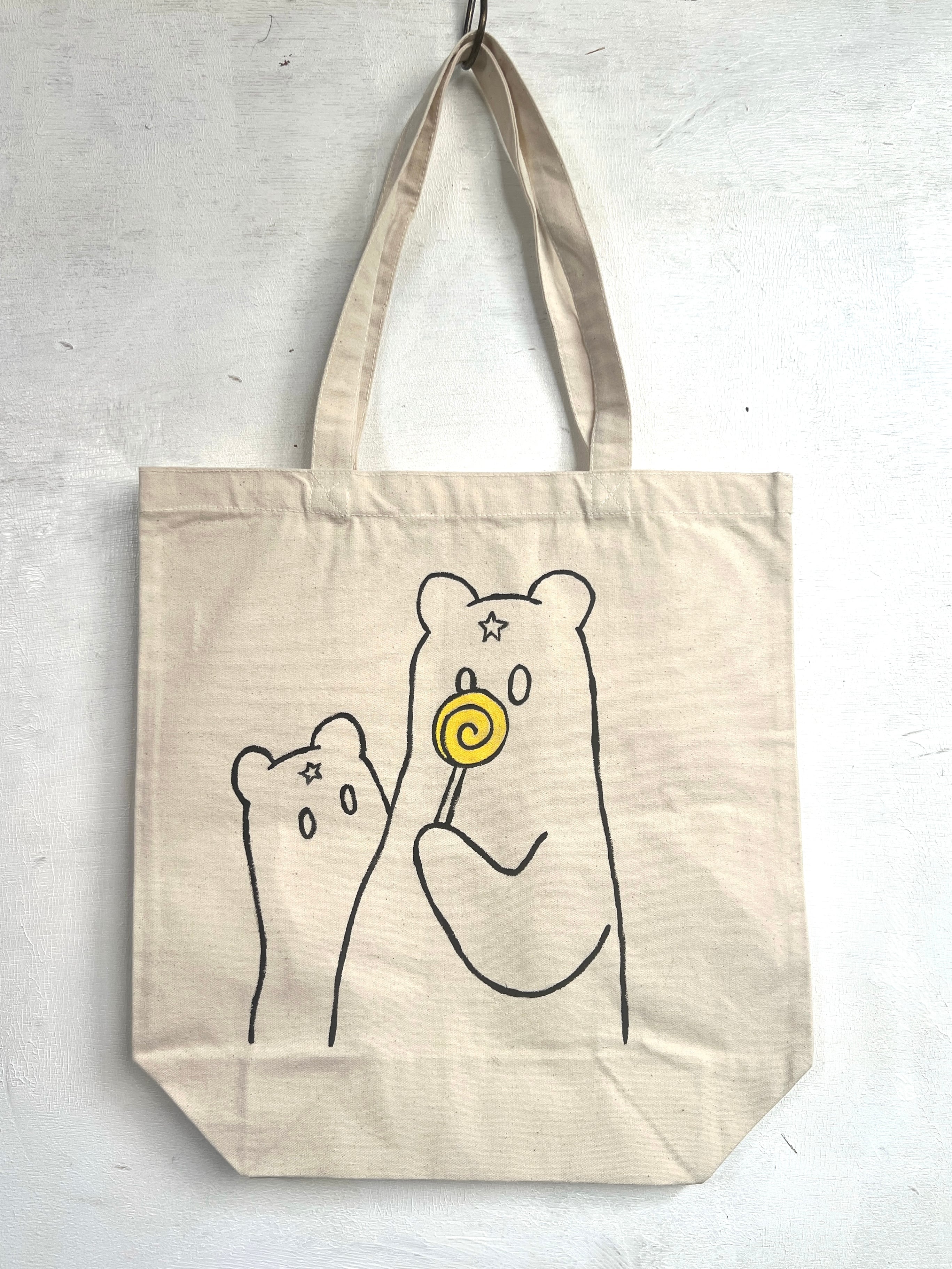 【1点もの】くまのおばけの手描きトートバッグ|A4対応|ナチュラルキャンバス|送料込み